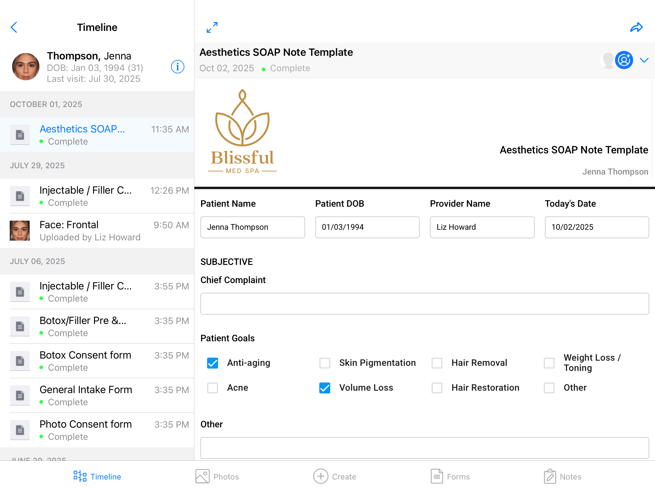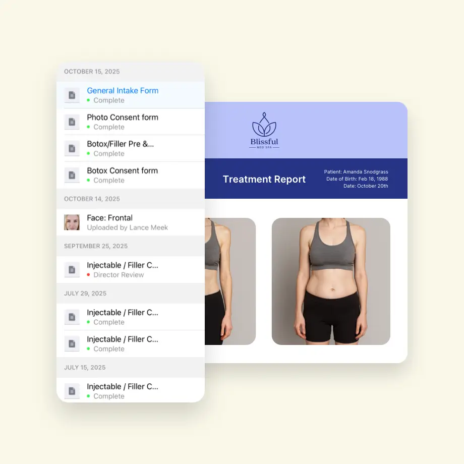 Forms, consent, clinical notes, and photos stay connected so providers can document faster and review patient history without switching systems.