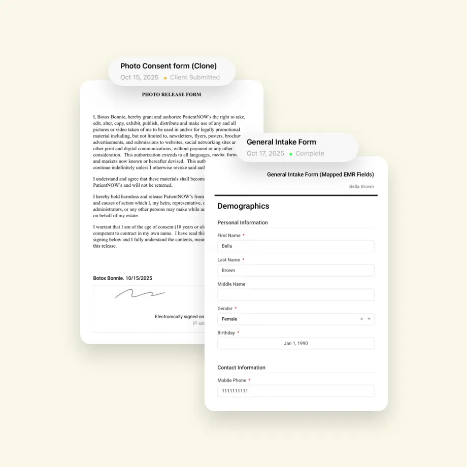 Create patient-facing forms for intake, consent, and treatment documentation. Patients can complete forms in office or remotely, and everything attaches automatically to the visit.